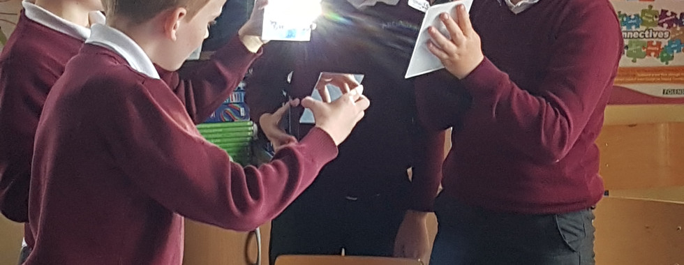 Throughout Science Week we got to explore the topic of Light every day. Each pod got the the chance to use mirrors to reflect light and try to make a Periscope. Explore the use of Red Green and Blue light and see how it makes our eye see white light. Use prisms and a light box to explore bending. Make simple circuits to make a bulb light up and then explore parallel circuits. We loved it. Our favourite experiment was seeing the coloured light hitting of the aerosol particles... the smell wasn't nice but the effect was great!